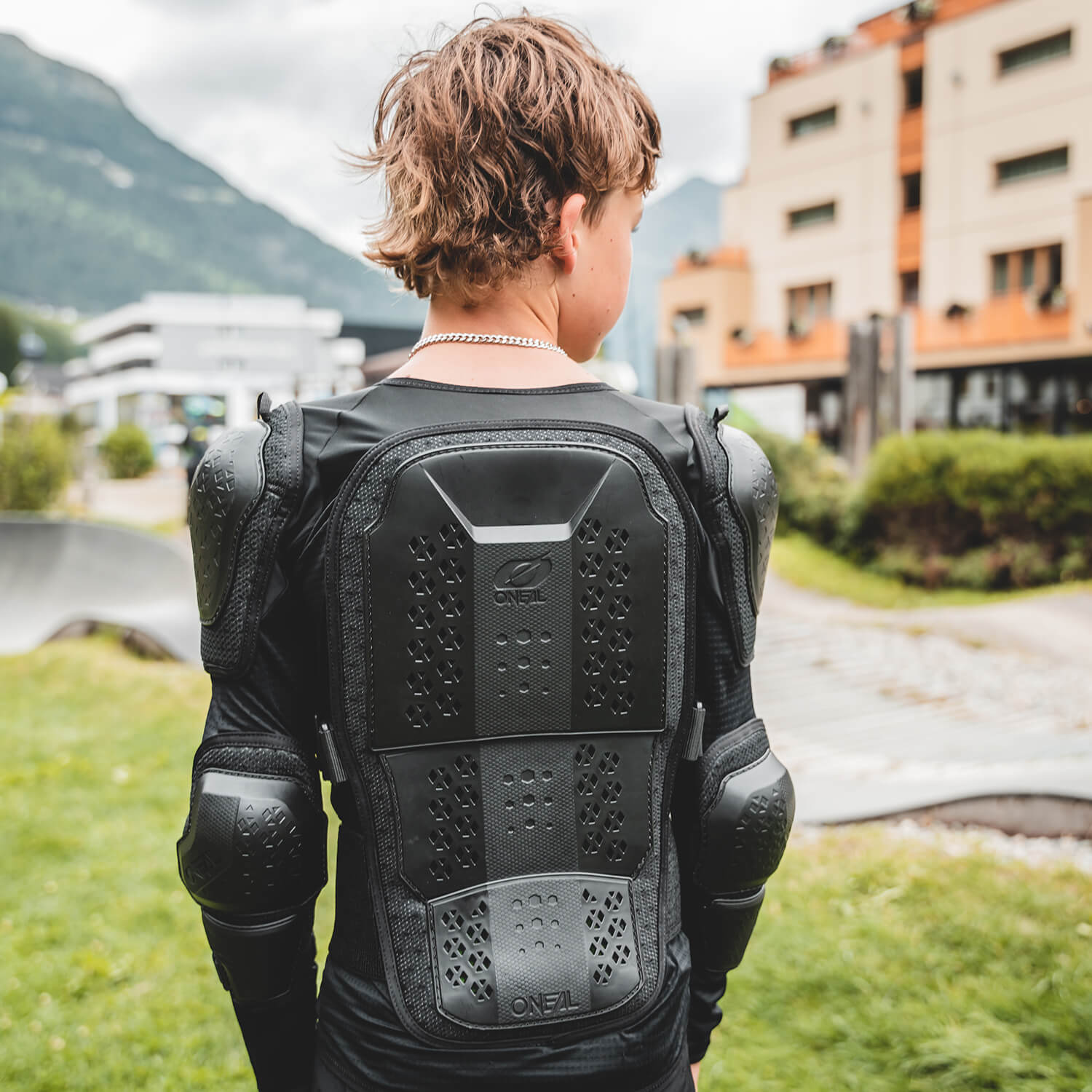 Eine Person mit lockigem Haar steht mit dem Rücken zur Kamera und trägt schwarze Schutzkleidung, darunter einen Rückenschutz und Ellbogenschützer. Sie befindet sich draußen auf einer Rasenfläche in der Nähe einiger moderner Gebäude. Im Hintergrund sind Berge zu sehen.
